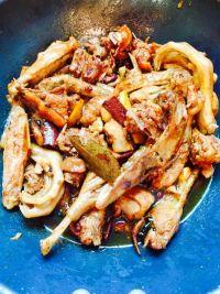 6.炸焦黄鸭头、鸭脚等,放入剩余鸭肉、大蒜子、姜片、八角、桂皮、香叶、花椒、料酒、翻炒均匀。