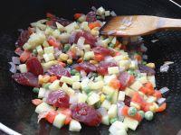 2.锅内热油,加入圆葱炒香,加入香肠翻炒出油