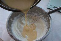 6.此时,淡奶油加20克糖打发至6成,放凉的牛奶液缓缓倒入淡奶中,搅拌均匀