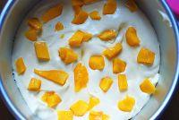 13. 继续倒完剩余的芒果糊,震几下去除气泡,放入冰箱冷藏2小时左右